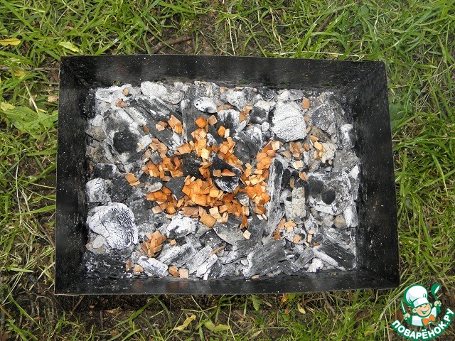 • За 15 минут до приготовления мы добавили ароматной щепы FORESTERS в угли, очень хорошая вещь! (предварительно нужно замочить в воде минут на 25)