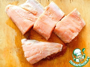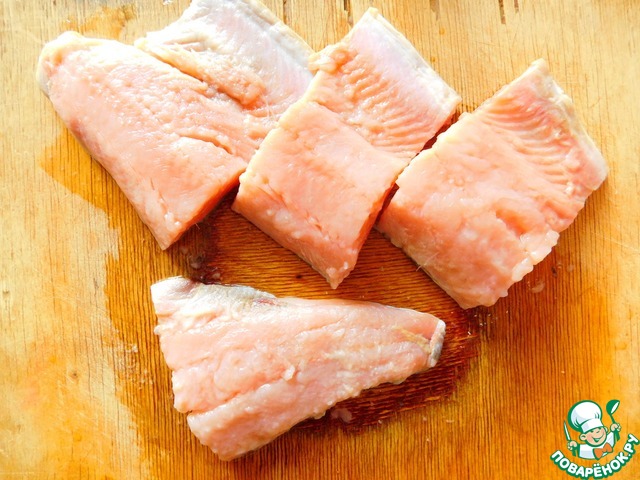 4 куска филе горбуши обмажем со всех сторон растительным маслом-у меня на каждый кусок рыбы ушло примерно 1 чайная ложка масла. Приправим рыбу солью и чёрным перцем по вкусу.