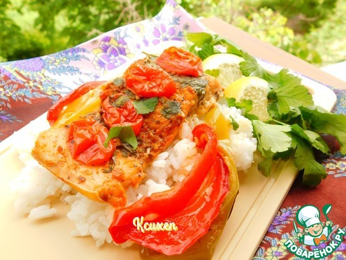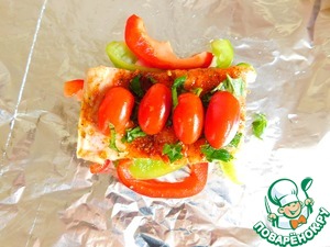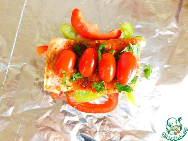 Выкладываем слоями сначала полоски перца, затем филе горбуши кожей вниз, сверху половинки помидорок, присыпаем всё рубленной петрушкой. -