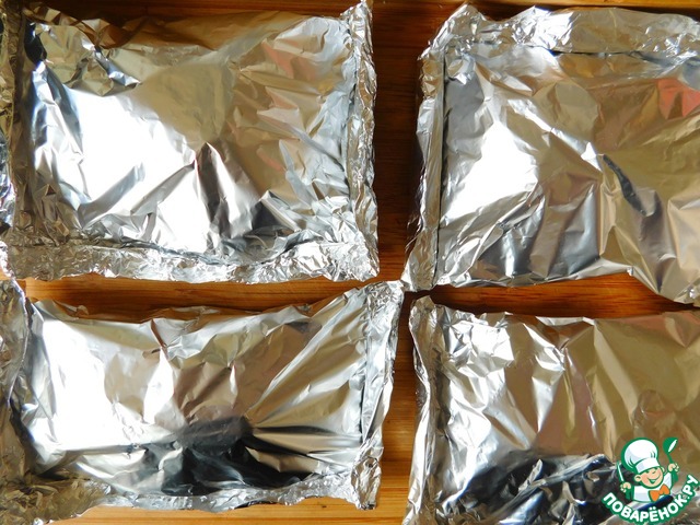 Запечатываем каждый конвертик, подворачивая края фольги наверх, что бы в процессе запекания не вытек насыщенный вкусами сок!