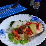 Подаём рыбу, выложив её на подушку и отварного риса.