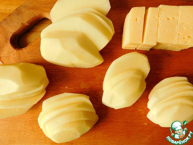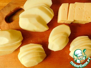 • Приготовление блюда я начала с картофеля: картофель чистим, моем и нарезаем тонкими кружками. Сыр нарезаем ломтиками.