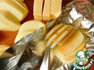 • 8 кусков фольги расстилаем, смазываем растительным маслом. Из картофеля формируем "многослойный бутерброд", чередуя слои картофеля и сыра, солим и перчим по вкусу. Заворачиваем каждую картофелину с сыром в фольгу и готовим на гриле 20-30 минут или до готовности картофеля. К сожалению, нас прогнал дождь, поэтому приготовление блюда я продолжила на веранде и запекла картофель в фольге в маленькой электрической печке.