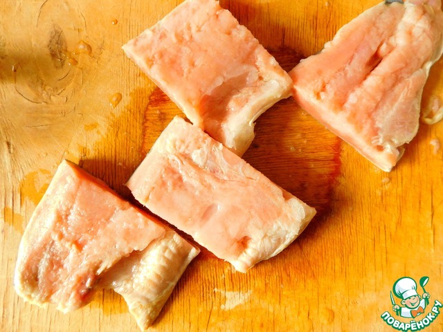 • Филе горбуши разрезаем на 4 порционных кусочка.