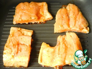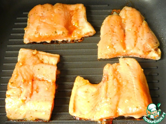 • Выкладываем филе кожей вниз на гриль ( в моём случае на сковороду-гриль) и готовим по 5-7 минут с каждой стороны до образования румяной корочки.
