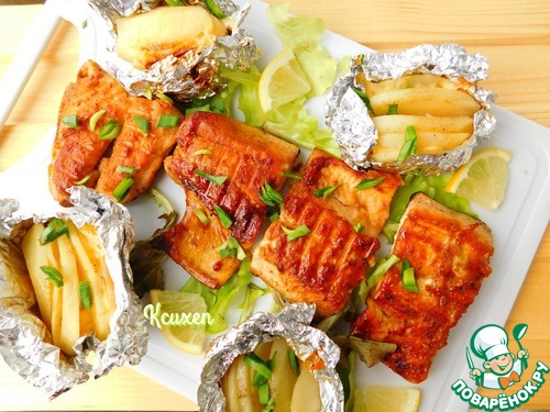 • Подаём филе горбуши с запечённым картофелем на подушке из листьев салата, присыпав зеленью. По вкусу можно добавить ломтики лимона.