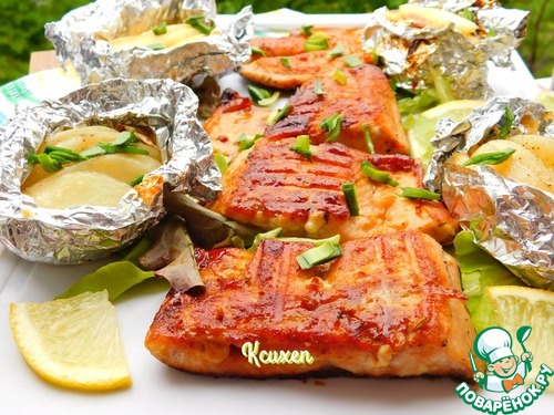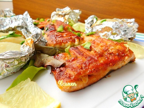 Горбуша получается сочная, в сладковатой румяной корочке! М-м.. оторваться невозможно! В дополнение к горбуше я предлагаю картофель, запечённый с сыром.