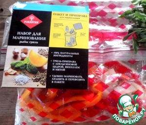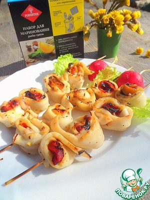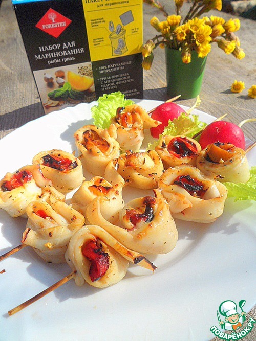 • Замариновать кальмары и перец на 1 час в смеси из 2 ст. л. растительного масла, соке ½ лимона и ¼ пачки «Набора для маринования рыбы гриль» от компании Forester.