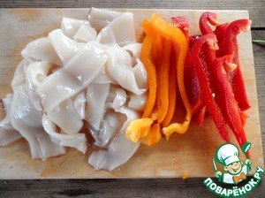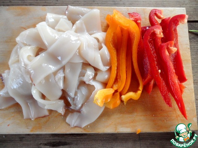 • Нарезать кальмары на узкие полоски, 2 цвета болгарского перца нарезать на полоски.