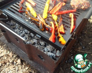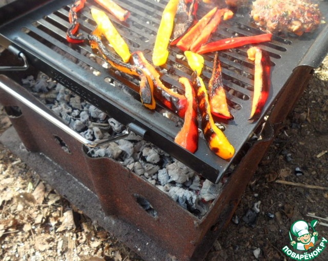 • На противень-гриль от компании Forester выложить полоски перца и обжарить на мангале. Удалить кожу.