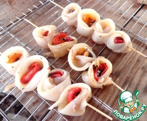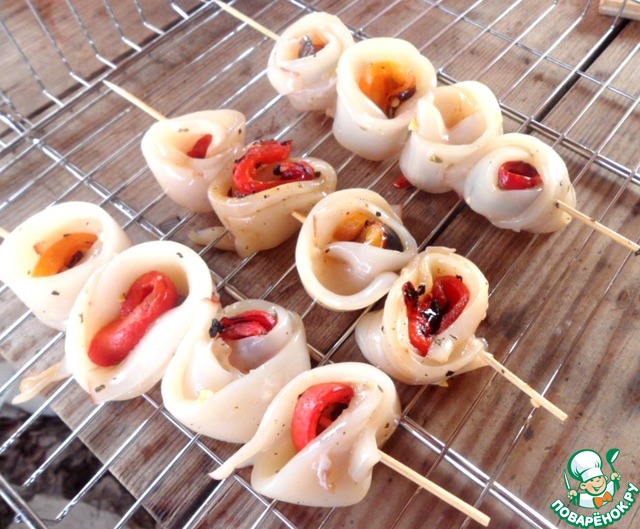• Скрутить рулеты из перца и обернуть их полосками кальмаров, нанизать на деревянные шпажки.