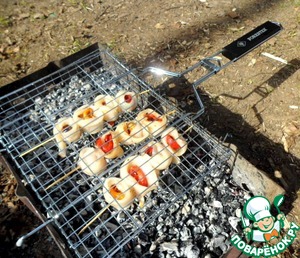 • Жарить будем на решетке-гриль от компании Forester на углях. Она имеет удобную длинную ручку, которая не нагревается и удобные фиксаторы с противоположной стороны, которые надежно удерживают решетку на мангале. Готовим с 2 сторон 5-6 минут.