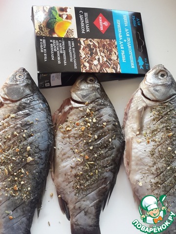 Натрите карасей специями внутри и снаружи. Я использовала специи для рыбы от компании "Форестер" - "Шашлык из рыбы с дымком" - чудесный состав, подобран именно для рыбы! -
