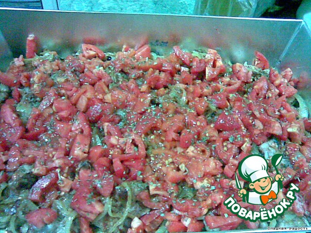 Пожарить лук и выложить сверху на мясо. Помидоры залить кипятком, снять шкурку и порезать кубиками, выложить на лук, посыпать солью и базиликом.