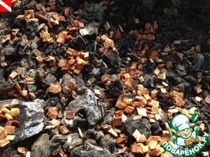 Щепу для подкопчения предварительно (за полчаса) замочить. Подготовить угли - разогреть до максиально жаркого состояния и разбросать влажную щепу.