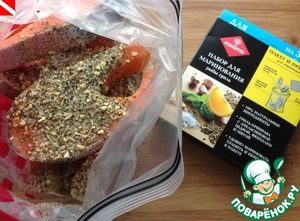Кусочки рыбы уложить в пакет для маринования, пакет плотно закрыть и оставить мариноваться на 1-2 часа (не дольше) в прохладном месте.