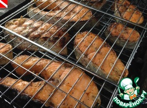 Жарятся стейки довольно быстро. Лучше почаще переворачивать решетку, чтобы семга равномерно проготовилась.