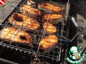 Решетку немного смазать растительным маслом. Замаринованные куски рыбы выложить на решетку