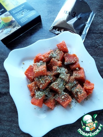 Нарезать рыбу средними кубиками. Посыпать приправой.