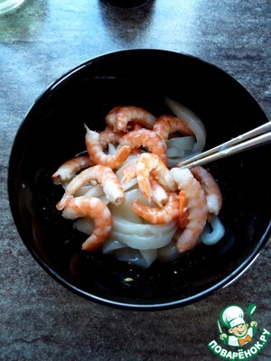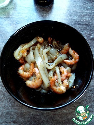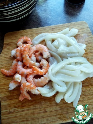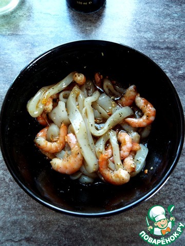 Креветки почистить, кальмар нарезать тонкими кружочками.