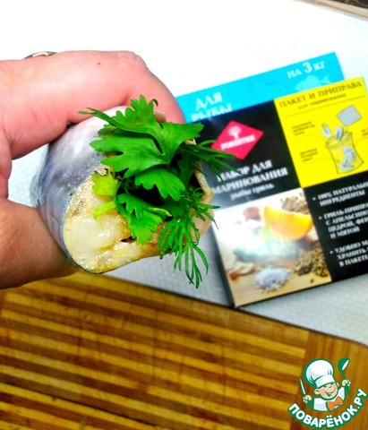 Рыбу выпотрошить (у меня была уже потрошенная), отрезать хвост, вымыть и обсушить. Брюшко натереть изнутри щепоткой смеси специй для рыбы от "Forester". Зелень вымыть, стряхнуть воду.