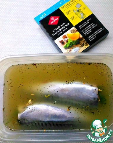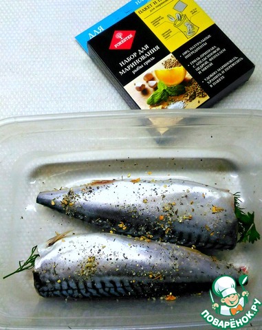 Сверху рыбу натереть специями от "Forester" для рыбы и сложить в емкость, где она будет мариноваться.