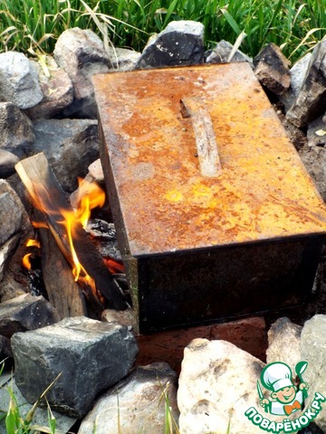 Щепу для копчения немного смочить. Выложить на дно коптильни. Одного пакетика специальной щепы от Forester будет достаточно.