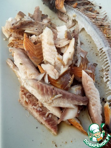 Нарезать или нарвать на кусочки. У меня ушло примерно половина рыбы.
