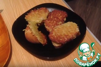 Батон нарезать и обжарить на сливочном или растительном масле с двух сторон.