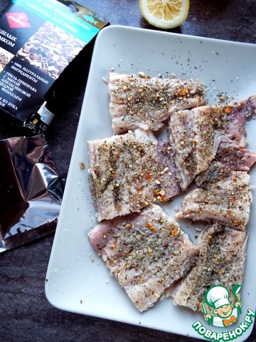 Я делала всю рыбу целиком и только два средних кусочка взяла для блюда. Рыбу надо посыпать приправой и сбрызнуть лимонным соком.