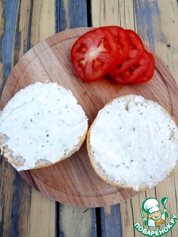 Булочки разрезать пополам. Можно прогреть на гриле.