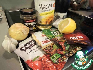 - Добавляем томатную пасту, горчицу и мед, приправляем массу тмином, молотой паприкой, молотым перцем, солью и перемешиваем. В -