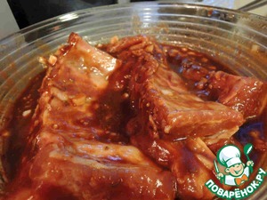 Укладываем свиные ребрышки в маринад и даем им промариноваться в течение нескольких часов. Идеально оставить их в холодильнике на ночь, а затем приступать к приготовлению.