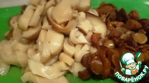Для начала необходимо отварить грибы в кипящей подсоленной воде минут 10, затем из нарезать тонкими ломтиками. У меня белые и лисички.