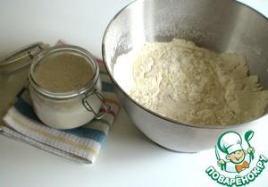 В чашу миксера всыпать просеянную муку, семолину, добавить оставшееся молоко (теплое), опару, соль, сахар, всыпать муку, замесить тесто. Оставить его на 30 минут для развития клейковины.