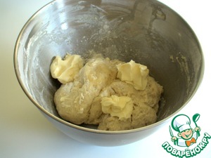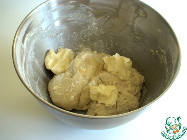 Затем добавить теплое сливочное масло, вымешать 2 минуты на 1 скорости, 4 минуты на 4 скорости.. Тесто хорошо вымешать. Оно должно быть пластичным, гладким.