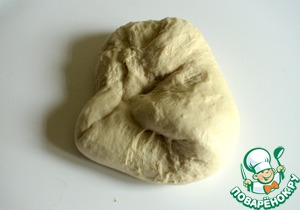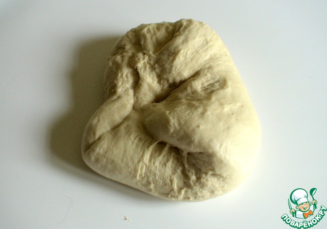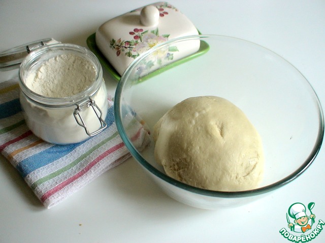 Тесто подкатать в шар, выложить в миску, смазанную растительным маслом, затянуть пищевой пленкой.
