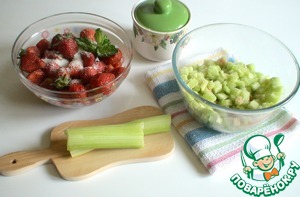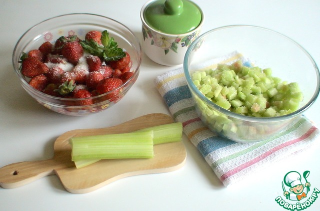 Пока тесто стоит на растойке займемся начинкой. Ревень помыть, почистить (снять "нити" по всей длине стебля, легко это сделать овощечисткой) порезать маленькими кусочками, засыпать сахаром, дать ему время пустить сок. Клубнику помыть, тоже засыпать сахаромна 30 минут