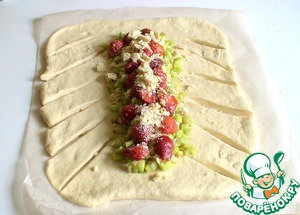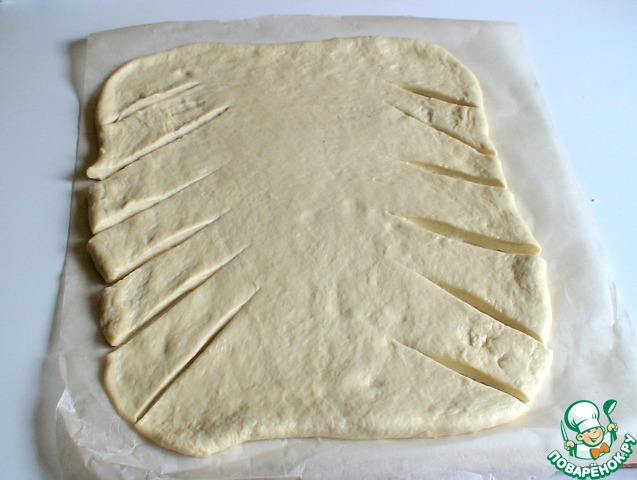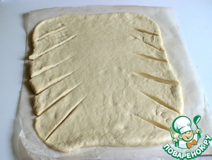 Готовое тесто подкатать, затем руками растянуть в прямоугольник, надрезать по краям.