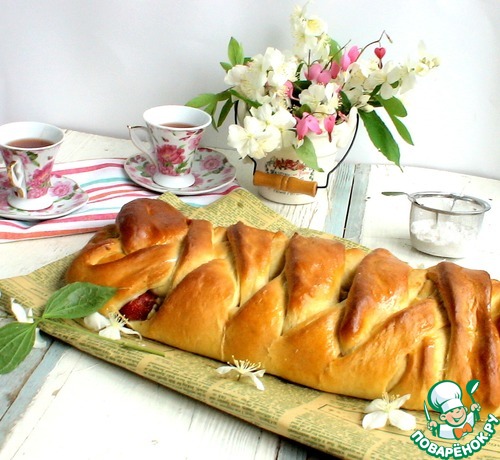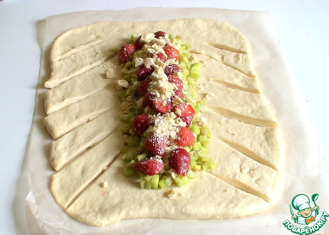 Посыпать равномерно середину манкой, на нее выложить начинку из ревеня засыпать половиной шоколада, сверху выложить разрезанную на половину клубнику, сверху снова белый шоколад и заплести наш пирог.