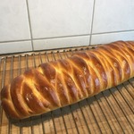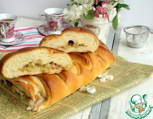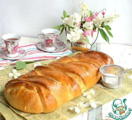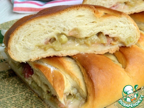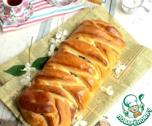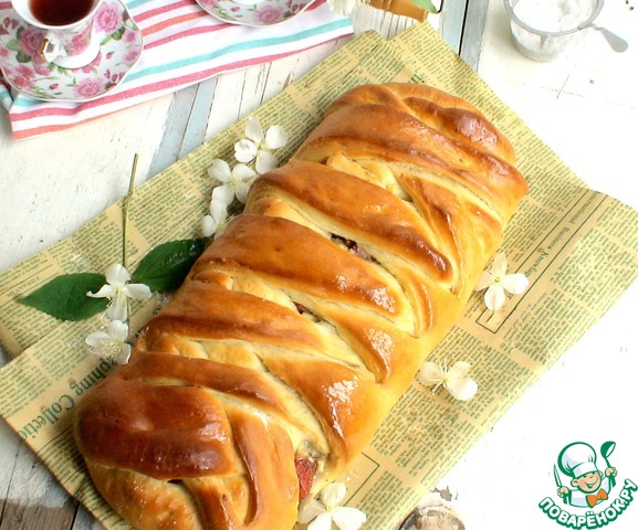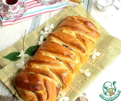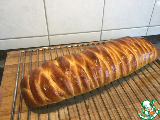 Лучше плести сразу на противне, вот такой пирог получается. Поставить на расстойку на 30 минут, сверху закрыть либо пленкой, либо противнем.