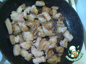 Нарезать сало с прослойкой и пережарить на сковородке, вынуть его,