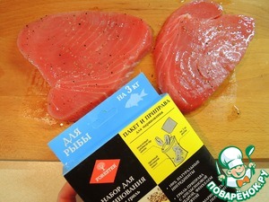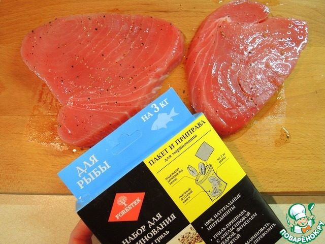 Стейки из тунца заранее разморозить в холодильнике. Гриль-приправу для рыбы смешать с растительным маслом и натереть стейки, оставить при комнатной температуре минимум на 30 минут.