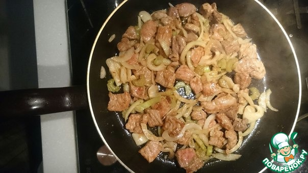 Мясо порезать на маленькие кусочки и бросить в сковороду.