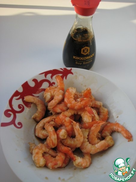Креветки почистить, замариновать в соевом соусе на 10 минут.