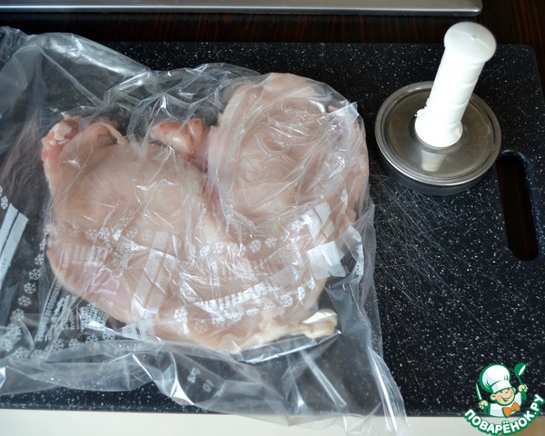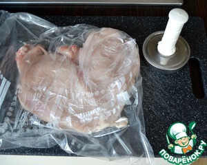 Куриную грудку поместить в целлофановый пакет и отбить, чтобы она стала тоньше.