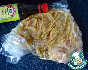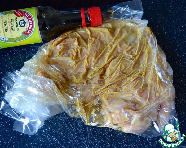 Залить маринадом курицу в пакете, равномерно распределить и оставить мариноваться минут на 30.