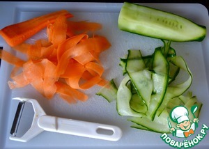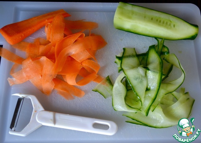 Для салата очистить морковь и нарезать тонкими длинными полосками, используя овощечистку.