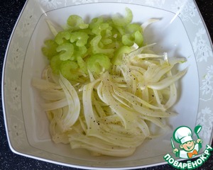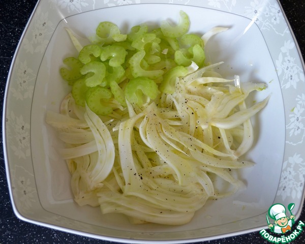 Нарезать тонкой соломкой половину клубня фенхеля, и также тонко нарезать стебель сельдерея.