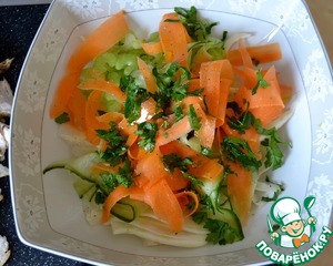 Добавить в миску нарезанные морковь и огурец, добавить измельченную зелень петрушки и перемешать.